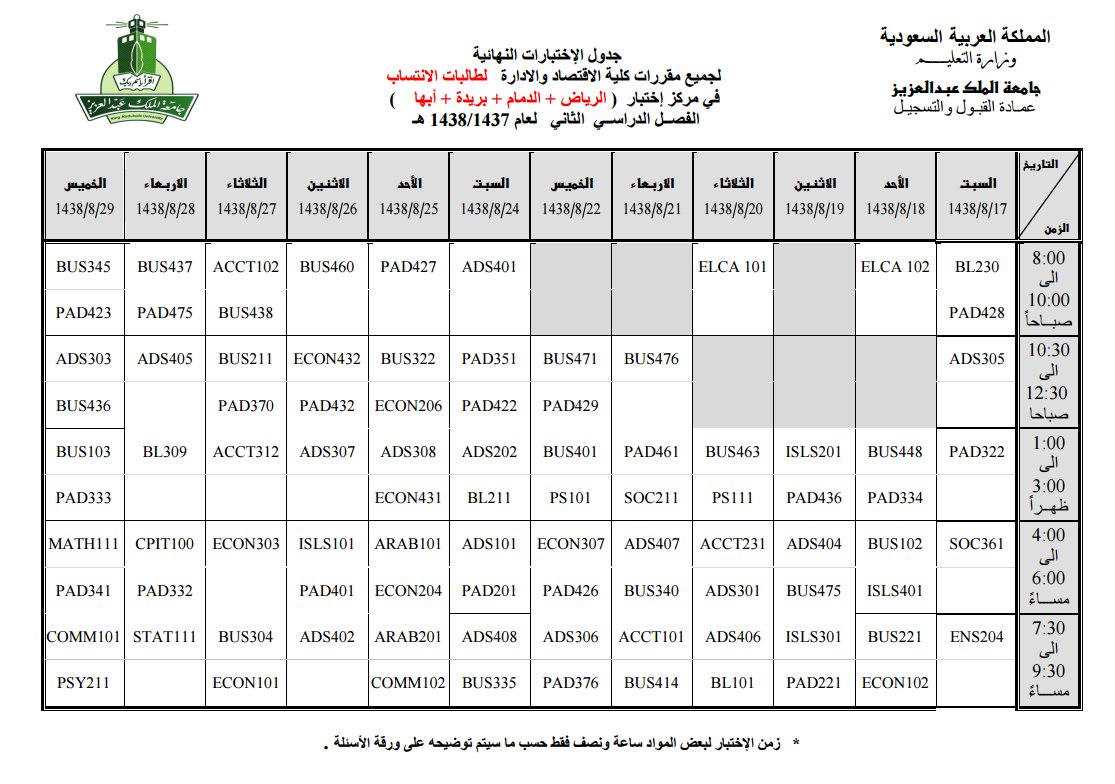 Uthman Alamoudi On Twitter جدول الاختبارات النهائي لطلاب جامعة الملك عبدالعزيز كليتي الآداب والإعلام انتساب جدة Https T Co Ypzihdehys Kau Https T Co Pjbjr7gxnk