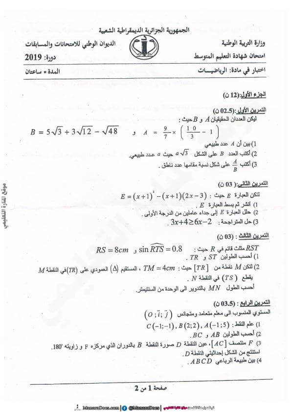 موضوع الرياضيات لشهادة التعليم المتوسط 2019 مع التصحيح