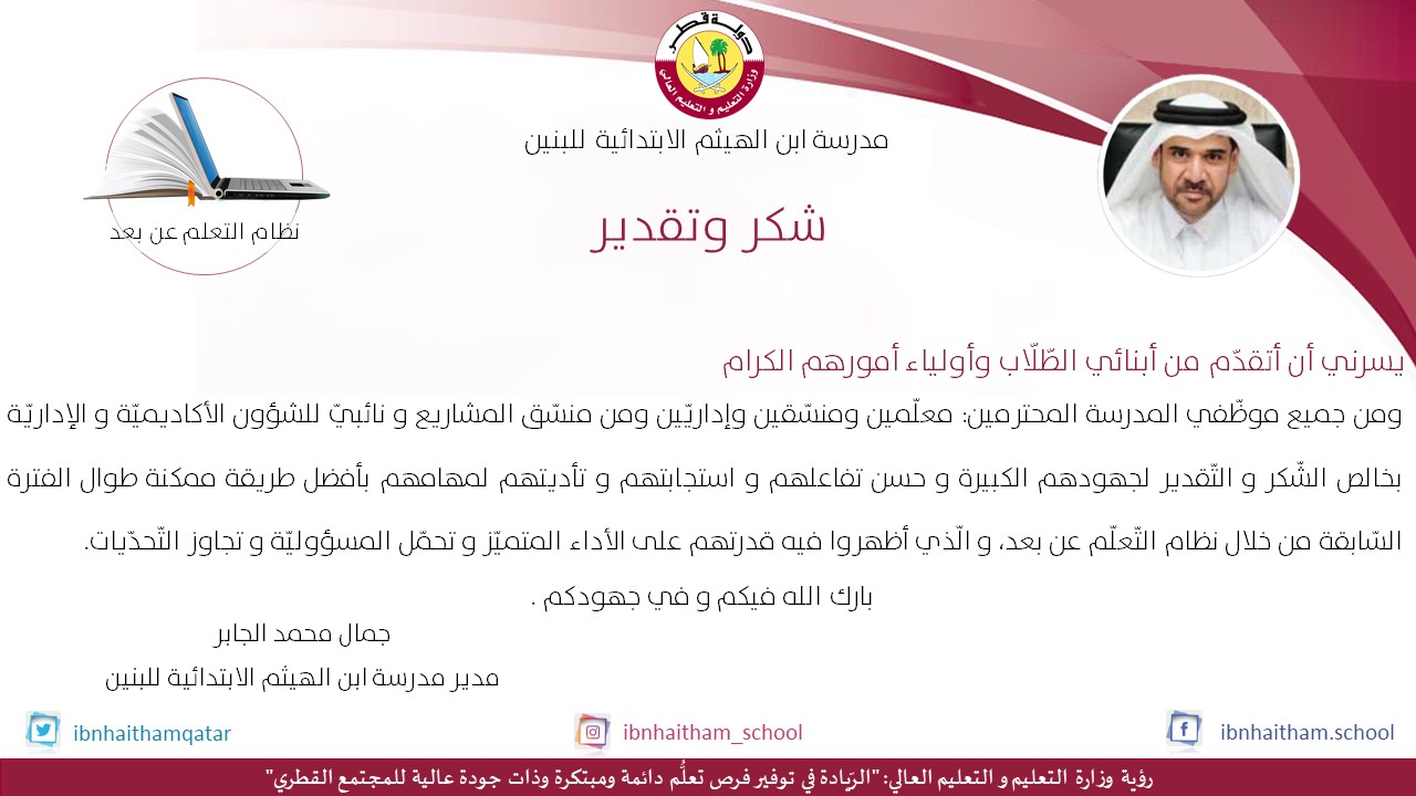 مدرسة ابن الهيثم Ibnhaitham School On Twitter التعلم عن بعد اتعلم لأجل قطر التعلم عن ب عد منصة قطر للمستقبل Qatar Edu Jamalaljaber6